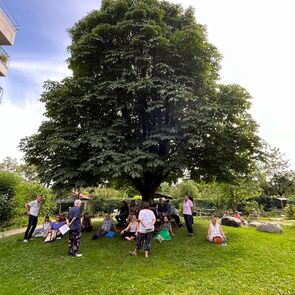 Weiter ging es am Nachmittag in den Domagkpark zu Führungen durch genossenschaftliche Projekte. Zur Wogeno eG mit seiner 3-stöckigen Fahrradgarage und der getreppten Dachterrasse, die ideal ist für Kino und Theatervorführungen. Beeindruckend sind immer wieder die Verbindungsbrücken zwischen den 5 Wohngebäuden von wagnisART der wagnis eG, die zur Begegnung einladen. Zuletzt noch das Projekt der FrauenWohnen eG, die sich ein Grundstück und die Dachterrasse mit der Wogeno eG in der Gertrud-Grunow-Straße teilt. Ein zentrales Ausstattungsmerkmal der FrauenWohnen eG ist die Barrierefreiheit, die über die Din-Normen hinausgeht und die Rücksicht auf das Sicherheitsbedürfnis von Frauen, dem mit einer ausgefeilten Lichtkonzeption entgegengekommen wird. Im Zentrum des gemeinsamen Innenhofs steht eine riesige Kastanie, die durch die sorgfältige Pflege vom Befall durch die Miniermotte geschützt werden kann.