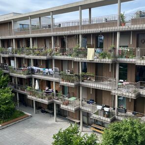 Um das Programm abzurunden zog die Gruppe am Samstagvormittag noch nach Freiham weiter. Der Stadtteil ist noch im Bau, aber die Genossenschaftsprojekte sind inzwischen bezogen. Die Fassadengestaltung und Architektur der Projekte sind ein Blickfang. Bei einer Führung durch das wagnisWEST-Projekt konnten die Besucher:innen einen Eindruck von der sehr besonderen Erschließung gewinnen. Das Treppenhaus des einen Gebäudes bietet auf jedem Stockwerk großzügige Aufenthaltsflächen. Dazu kommt ein doppelstöckiger Gemeinschaftsraum. Ausgeglichen werden diese Flächen durch eine sehr reduzierte Erschließung in den anderen Gebäuden. Die Zeit war leider zu knapp, um die anderen Projekte noch genauer anzuschauen, denn die Fahrkarten für die Rückfahrt waren reserviert. Die Berliner Kolleg:innen waren auch so begeistert von dem, was die Münchner Projekte Szene auf die Beine stellt und werden sicher wieder kommen.