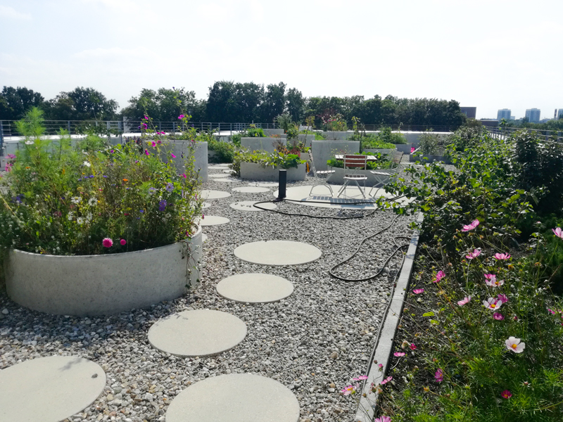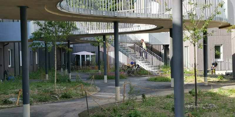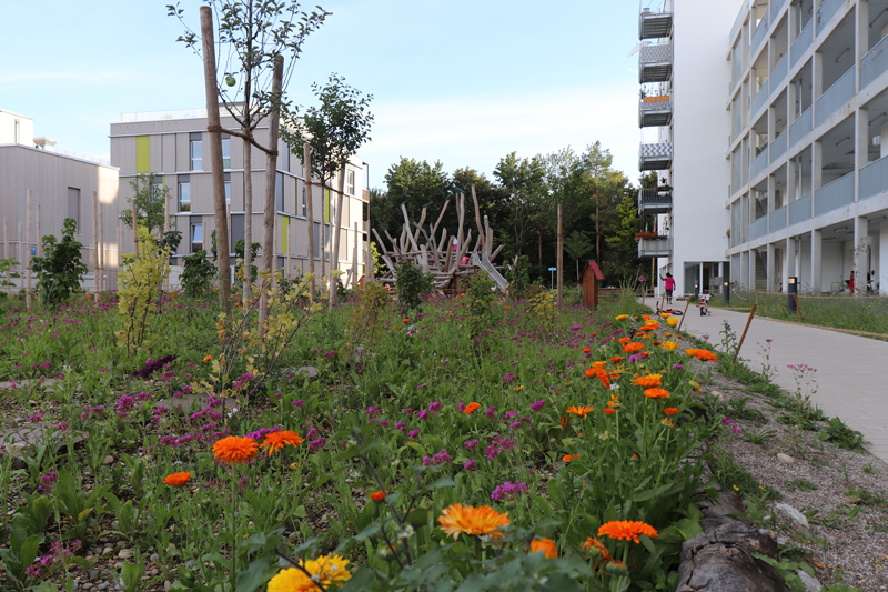 Das Wohnumfeld trägt maßgeblich zum Gesicht einer Siedlung bei. Wir fühlen uns dieser Umgebung verpflichtet. Sie muss mehr sein als die Aneinanderreihung von notwendigen Funktionen wie Spielplatz, Feuerwehrzufahrt, Parkplatz, Standorte für Müllentsorgung und Wohnungsgärten. Sie sollte einladen zum Treffen, Verweilen und Entspannen, ebenso wie für Aktivitäten wie Spielen und Gärtnern. Dabei sind nicht nur die ebenerdigen Flächen von Belang, sondern genauso Balkone Loggien, Laubengänge und vor allem die Dachflächen. Dass dabei auch Wert auf die ökologischen Belange wie Artenvielfalt, Wasserhaushalt und ortstypische Materialien gelegt wird versteht sich von selbst. So entstehen in gemeinsamem Planungsprozess mit den Nutzern jeweils für den Ort angepasste Lebensräume für Menschen, Tier und Pflanze, auf dass sie in guter Nachbarschaft leben.