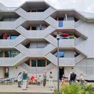 Mit dem Wabenhaus in der Messestadt Riem West ist der Wogeno München eG ein „Hingucker“ gelungen. Das Gebäude in der Den-Haag-Str. setzt sich aus sechseckigen, horizontal aufeinander gestapelten wabenförmigen Röhren zusammen, die in Form eines großen Wabenstocks montiert wurden.